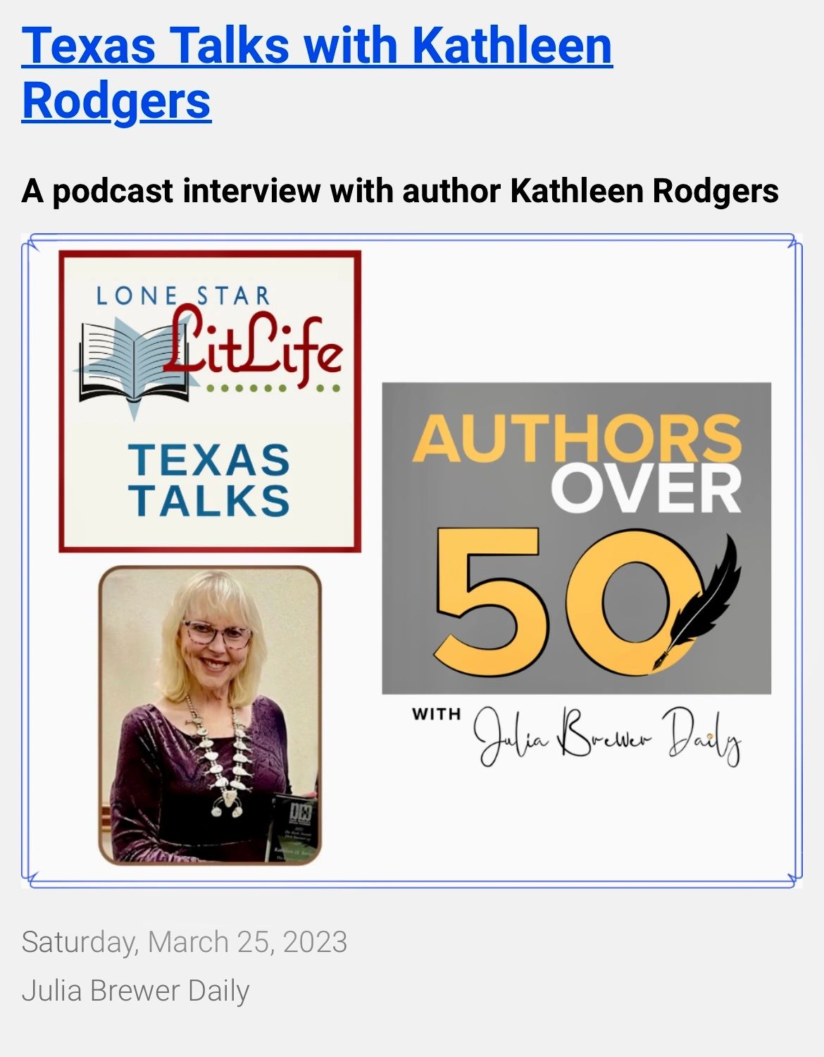 So honored that my conversation with Authors Over 50 podcast host Julia Brewer Daily made "Texas Talks" in this latest edition of Lone Star Literary Life.